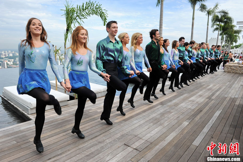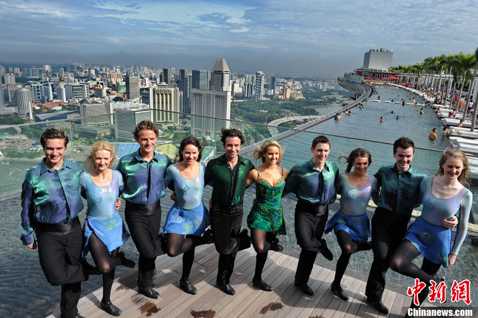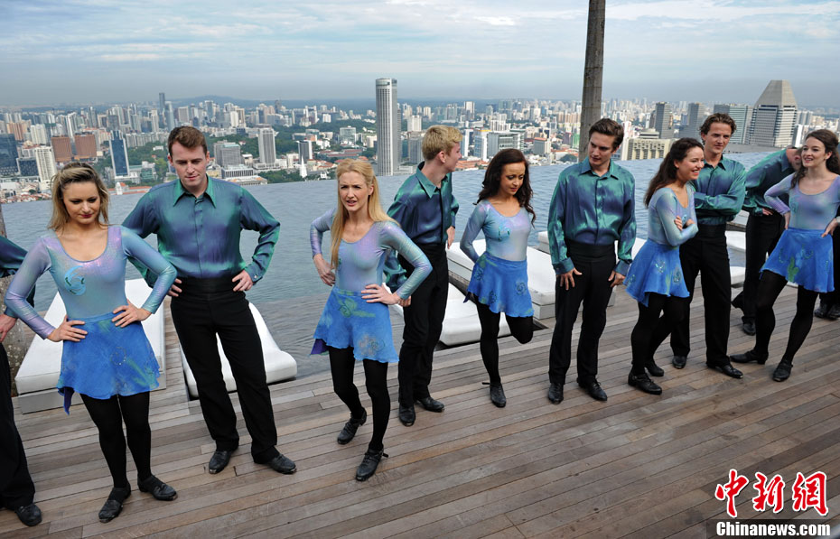 圖為大河之舞愛爾蘭舞蹈團成員在新加坡濱海灣金沙酒店的空中花園合影。