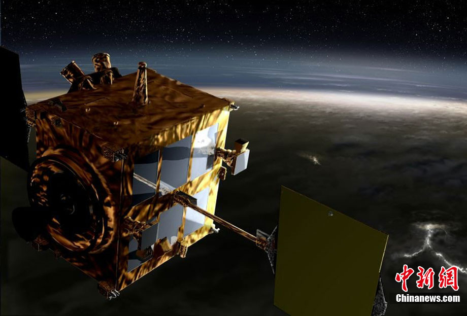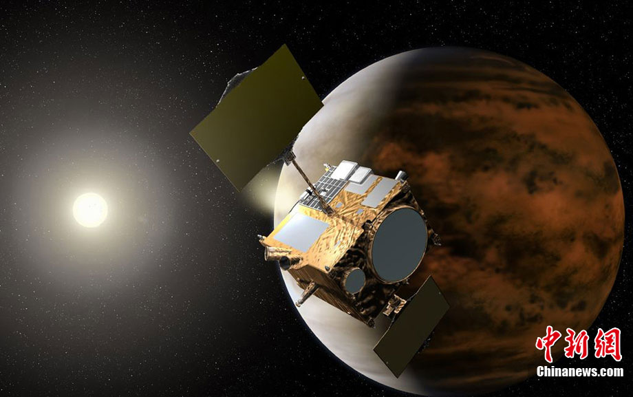 2010年5月發射升空的日本金星探測器“拂曉”號于日本時間12月7日上午抵達距離金星最近處,并進行為進入環繞軌道的引擎反向噴射。圖為日本金星探測器“拂曉”號抵達金星上空的模擬圖。