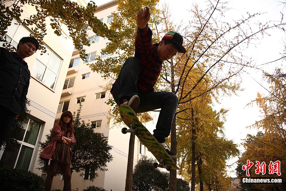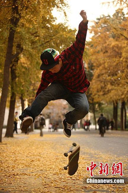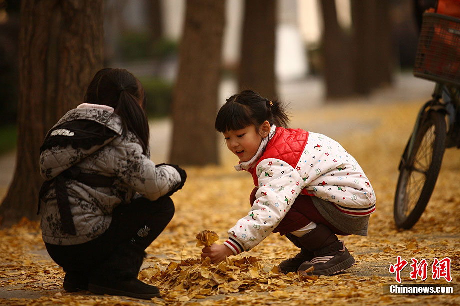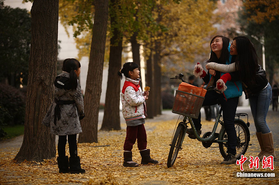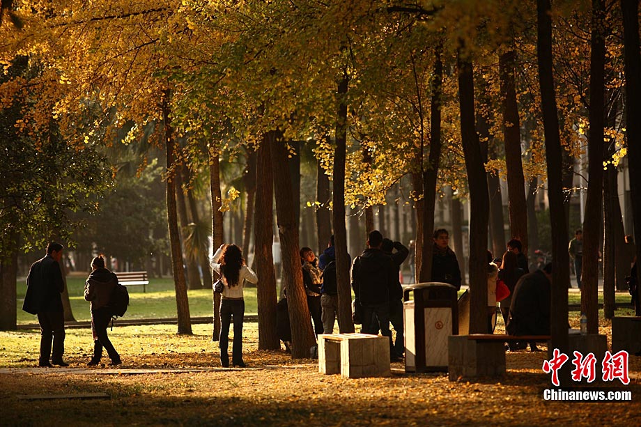 銀杏樹作為成都市的市樹,每年11月底到12月初是市民觀賞銀杏的最佳時期,面對市民發出的“保留銀杏落葉景觀”呼聲,成都市環衛部門于2009年對部分街道的銀杏落葉首次采取“只撿不掃”的措施,2010年,成都環衛部門繼續采用了這一人性化措施,將銀杏落葉景觀長時間留給市民。中新社發 張浪 攝