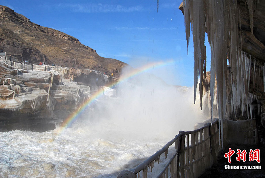 12月15日,受大風降溫天氣的影響,黃河壺口段開始大面積流凌。壺口瀑布兩岸的巖石和護欄上也開始凝結一排排美麗壯觀的冰掛,晶瑩剔透,造型各異,與瀑布中飛舞的彩虹交相輝映,為冬日的壺口瀑布平添了幾分秀色,讓許多游客流連忘返,頻頻舉起手中的相機拍照留念。呂桂明 攝 圖片來源:CNSPHOTO