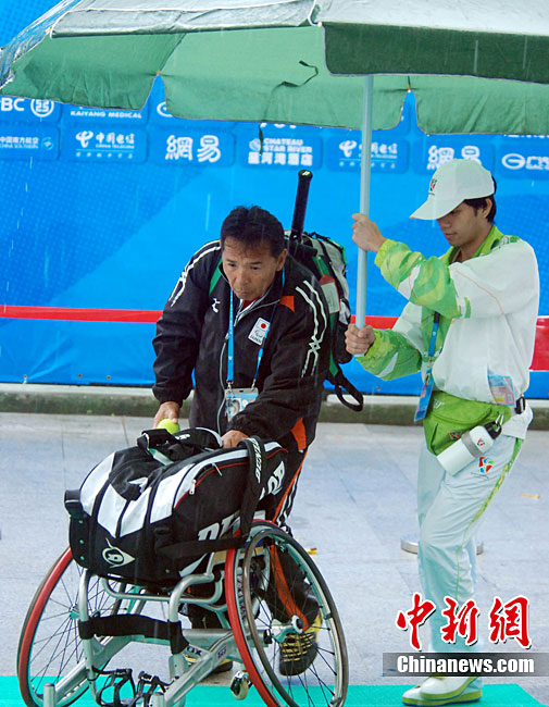 12月15日,志愿者雨天為運動員撐傘護航,無微不至。廣州2010亞殘運會,輪椅網球比賽在廣州天河體育中心網球學校舉行,因雨比賽從室外轉向室內。尹雪峰 攝
