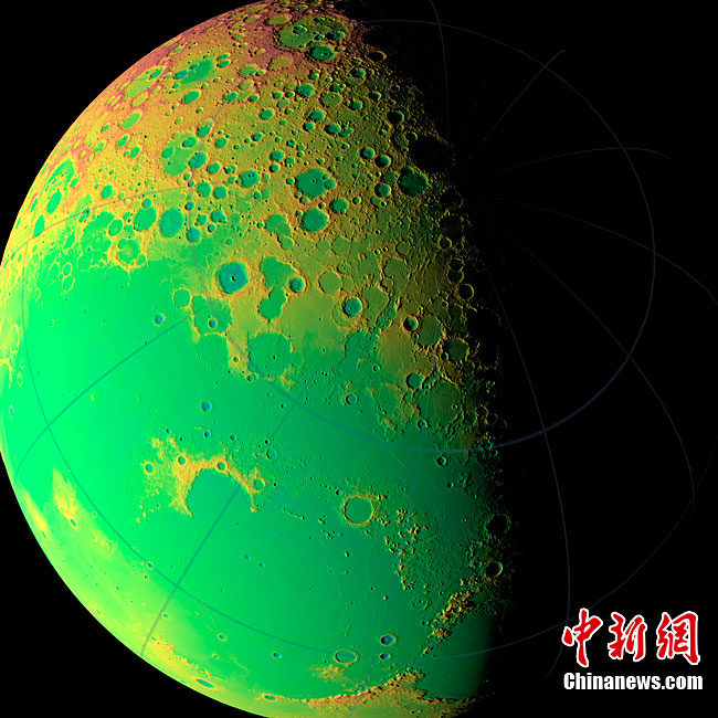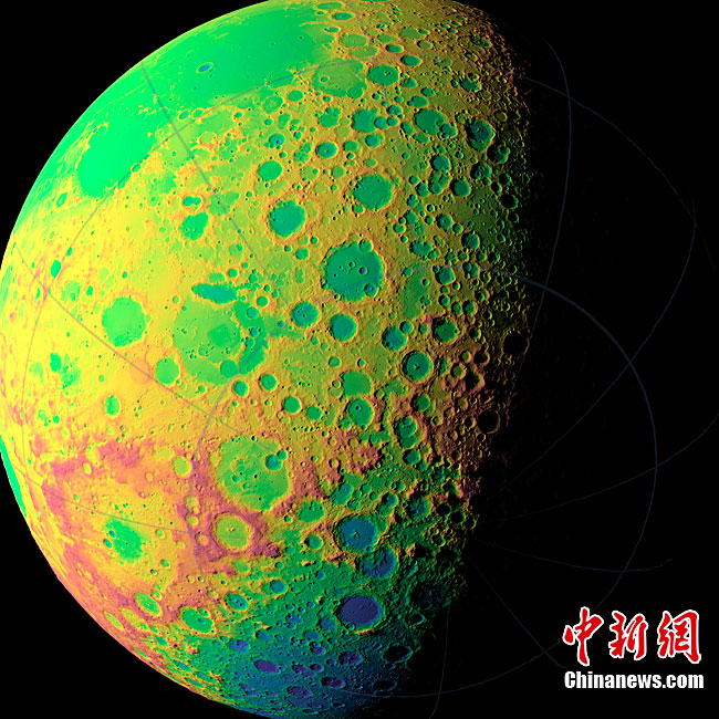 12月17日,美國航天局對外公布了月球勘測軌道飛行器攜帶的月球軌道飛行器激光測高儀(LOLA)對該地點進行的高度測量。科學家稱,月球勘測軌道飛行器使研究者能制造出最精確且最完整的月球地形圖。紅色代表月球最高點,藍色代表最低點。