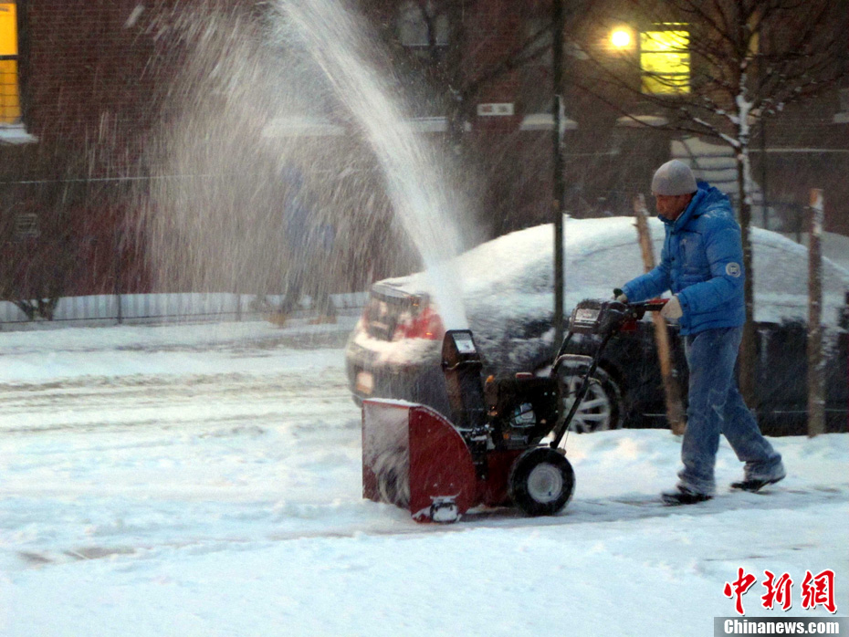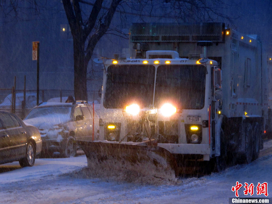 一場暴風雪26日撲向美國東北部的新澤西州、紐約市等地,同時伴有時速達到四五十哩的勁風,預計26日及27日為這些地區帶來十英寸左右的積雪。公路行車危險大增,卷起的漫天白雪可能造成航班嚴重誤點,導致華盛頓、紐約和波士頓機場近日取消航班。圖為紐約法拉盛街頭掃雪車正在清理公路積雪。中新社記者 孫宇挺 攝