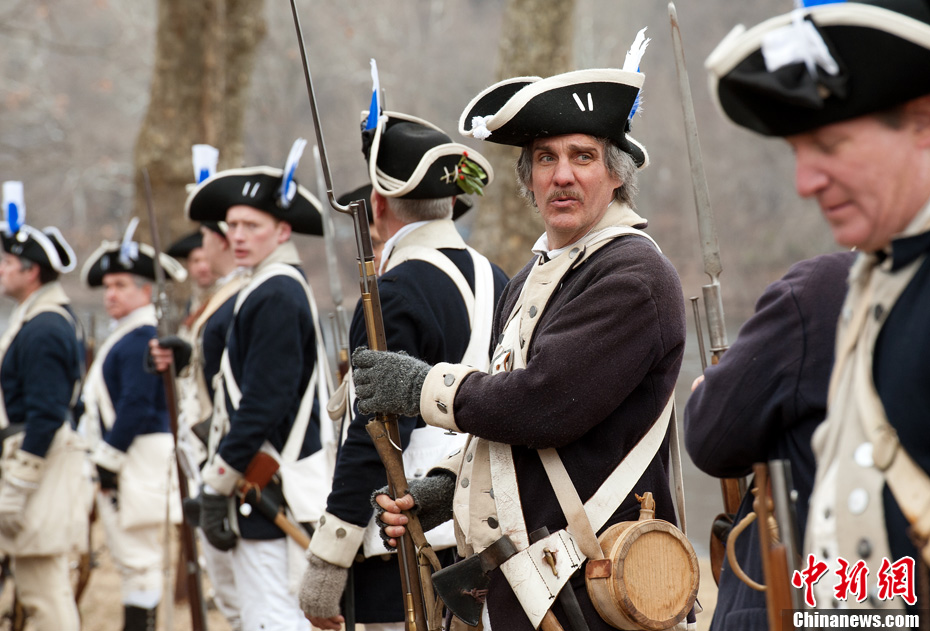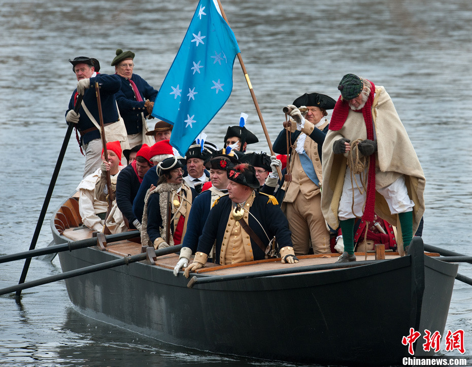 12月25日圣誕節,在美國賓夕法尼亞州華盛頓橫渡歷史公園,身著美國獨立戰爭期間大陸軍軍裝的“士兵們”在“喬治·華盛頓”(右二)的引領下乘船渡過特拉華河。