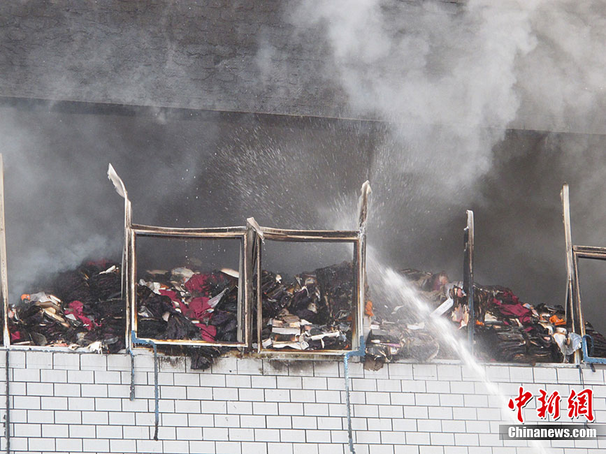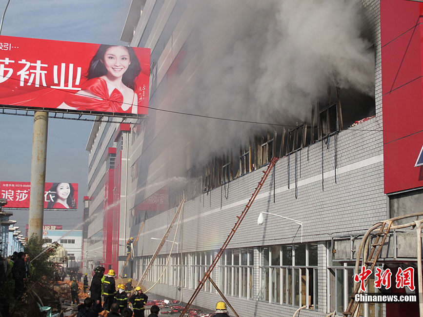 12月28日上午10時50分許,浙江省義烏市知名企業(yè)浪莎集團(tuán)倉庫樓發(fā)生火災(zāi)。因火勢較大,金華消防總共出動了三十幾輛消防車參與救火,倉庫內(nèi)9名工作人員均已安全疏散,確定無人員傷亡情況。張茵 攝