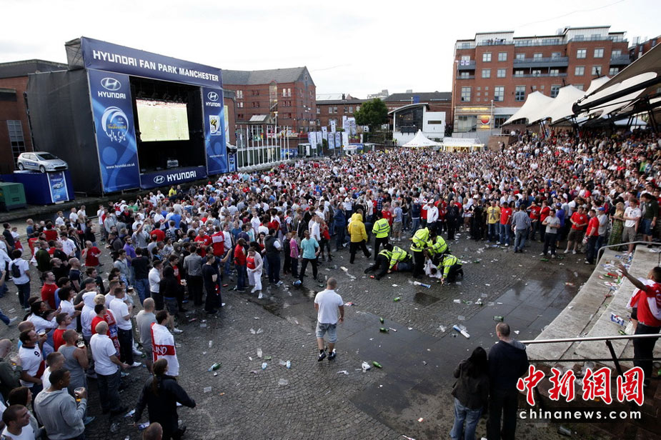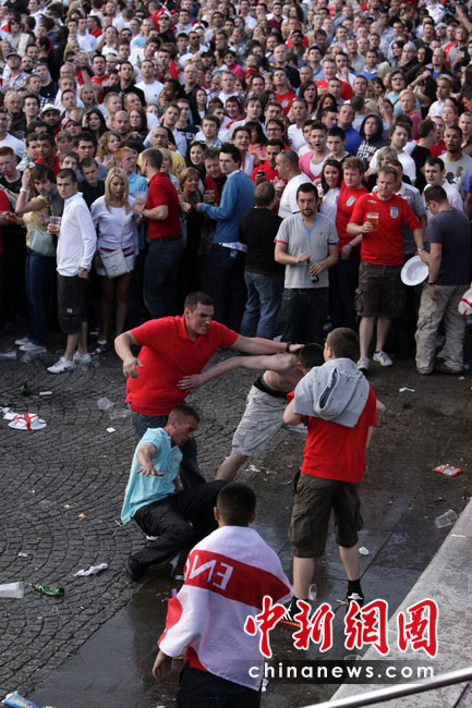 6月11日,南非世界杯揭幕戰在約翰內斯堡足球城球場舉行,中場休息時球迷在休息區舉箱豪飲啤酒。中新社記者 廖攀 攝