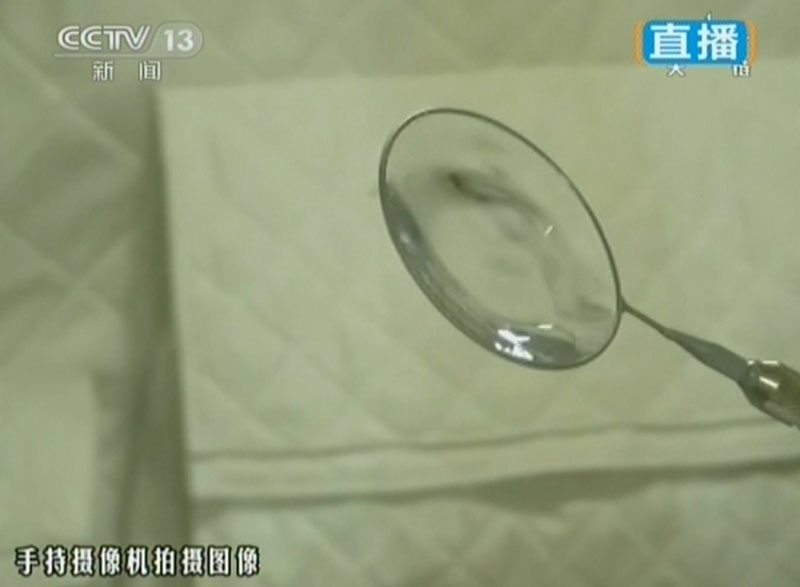 6月20日上午10時許,神舟十號航天員進行中國首次太空授課,女航天員王亞平擔任主講,成為中國首位“太空教師”。圖為王亞平進行“水膜”演示。(視頻截圖)
