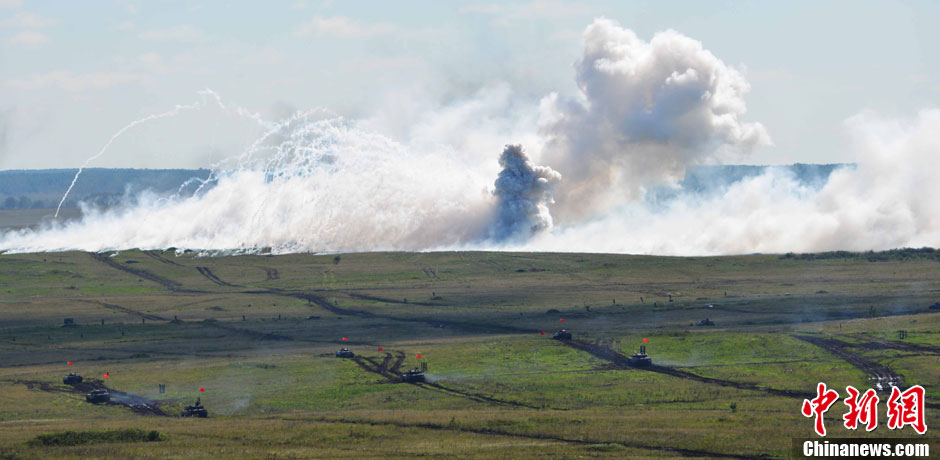 8月12日12時(北京時間下午2時),“和平使命-2013”中俄聯合反恐軍事演習,在俄羅斯切巴爾庫爾合同訓練場進行了實兵實彈協同訓練。圖為中方裝甲車成攻擊隊形向敵縱深發展攻擊。中新社發 譚長俊 攝