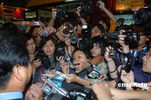 十月十八日,眾多媒體記者在威尼斯人會(huì)展中心舉行的第十二屆澳門國際貿(mào)易投資展覽會(huì)(MIF)上,爭搶采訪某省的負(fù)責(zé)人。規(guī)模宏大,盛況空前的第十二屆澳門國際貿(mào)易投資展覽會(huì)(MIF),以努力打造成國際貿(mào)易平臺(tái)為己任,引起了新聞媒體的極大關(guān)注。中新社發(fā) 史利 攝