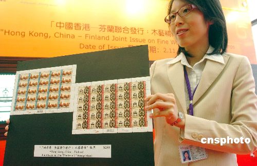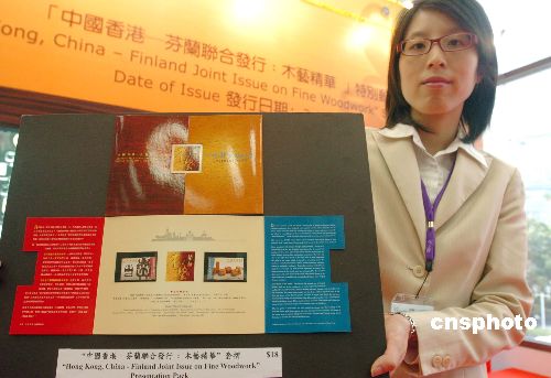 11月2日,香港郵政署與芬蘭聯合發行“木藝精華”特別郵票舉行發行儀式,該套兩枚面值港幣五元的郵票,分別展示中國香港的清代夔龍紋紫檀太師椅,以及芬蘭的千禧年代橢圓皺紋樺木盛器。圖為香港郵政署職員展示“木藝精華”特別郵票的套折。中新社發 鄧慶樂 攝