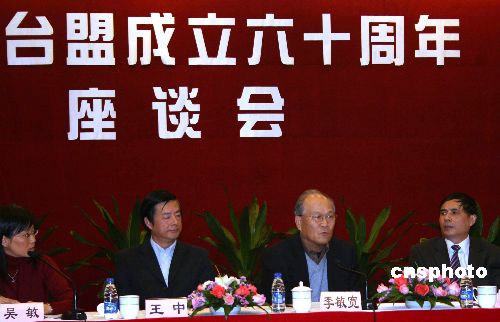 十一月十日,近百位上海老中青三代臺胞、臺盟盟員聚會座談,紀念臺灣民主自治同盟成立六十周年。當日,臺盟上海市委還舉行了“電影劇本《啊,謝雪紅》讀書演講會”,緬懷臺盟首任主席、臺灣知名人士謝雪紅女士。一九四七年十一月十二日,臺盟在香港成立,是當代中國八個民主黨派之一。圖為臺盟中央副主席李敏寬(右二)在座談時表示,臺盟走過了六十年愛國的革命的光榮道路,始終與中國共產黨風雨同舟、長期合作。中新社發 許曉青 攝