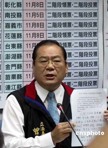 中國國民黨立法院黨團十一月十四日表示,支持十八個縣市選舉委員會的決定,希望明年“立委”選舉與“公投”同日舉行時,采用“二階段領票,二階段投票”方式,讓選舉順暢單純。圖為國民黨政策會執行長曾永權出示全臺灣二十五個縣市議會議長的共同聲明,他們表示支持這一投票方式。中新社發 劉舒凌 攝