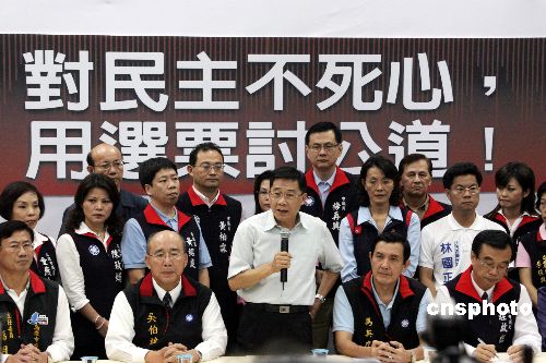 11月16日,高雄市長選舉官司在當地二審定讞。代表中國國民黨的候選人黃俊英(前中)在選舉無效和當選無效兩項訴訟中均遭判敗訴。民進黨的陳菊在去年12月9日勝出擔任市長后,今次獲終審保住余下任期。今年6月15日,該官司一審曾判,選舉有效,但陳菊當選無效。圖為黃俊英獲知敗訴后,在中國國民黨主席吳伯雄(前左2)和明年大選候選人馬英九(前右2)等陪同下,于競選總部與媒體見面,對選舉結果表示失望,并希望擔任義工幫助同黨候選人贏得今后選舉,以討回公道。中新社發 黃少華 攝
