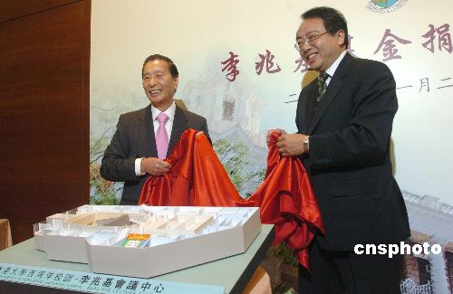 11月22日,香港恒基兆業地產有限公司主席李兆基博士捐贈五億港元予香港大學,以促進港大未來的發展計劃,會上李兆基博士(左)與香港大學校長徐立之教授為“香港大學百周年校園---李兆基會議中心”模型舉行揭幕儀式,新校園計劃于2011至2012年落成。中新社發 鄧慶樂 攝