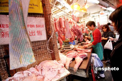 12月4日,香港市民如常在街市購買新鮮豬肉。當日,香港豬肉總商會表示,五豐行連續第3日供港豬肉短缺,令部分肉檔要提早關門。五豐行拍賣的豬肉只是平日的6成半,而活豬的批發價每擔上升50至80元,但零售肉價維持不變。中新社發 洪少葵 攝