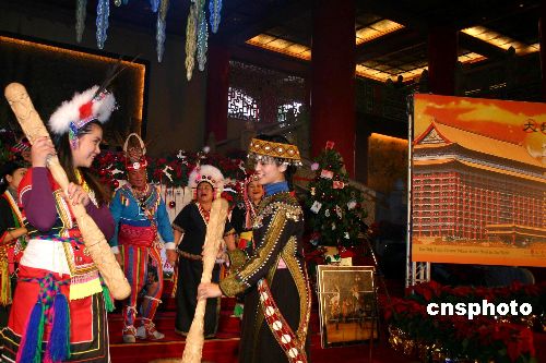十二月五日下午,古色古香的臺北圓山飯店舉行圣誕點燈儀式,并請來原住民作為大地的代言人,從大地采光,點燃圣誕之燈。據了解,今年圓山飯店的圣誕樹造型的燈使用環保材料,圣誕之后,仍可用作日常的照明。中新社發 陳國華 攝