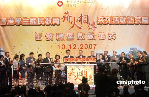 12月10日,香港教育局舉辦的“香港學生國民教育薪火相傳系列活動訪京團”在香港會展中心舉行出發(fā)典禮﹑授旗及啟動儀式。香港政務(wù)司司長唐英年及中聯(lián)辦副主任李剛及教育局局長孫明揚等為活動主持啟動儀式。中新社發(fā) 鄧慶樂 攝