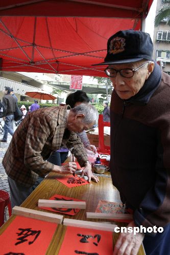 十二月十四日,二00七臺北眷村文化節開幕,老人們在活動現場書寫對聯。中新社發 陳國華 攝