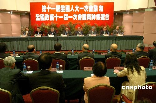 三月二十五日,“第十一屆全國人大一次會議和全國政協十一屆一次會議”精神傳達會在澳門世貿中心舉行,澳門中聯辦主任白志健、澳門特首何厚鏵出席會議并發表講話。數百名澳門各屆人士聽取了出席第十一屆全國人民代表大會澳門區代表作的關于“兩會”的情況報告。中新社發 史利 攝