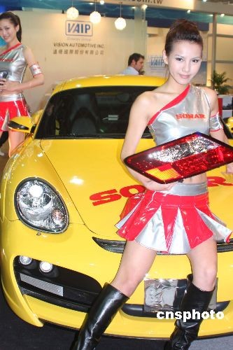 4月9日,“臺北國際汽車零配件展覽會”在新落成的臺北南港展覽館開幕。圖為一個參展攤位的香車美女。中新社發 董會峰 攝