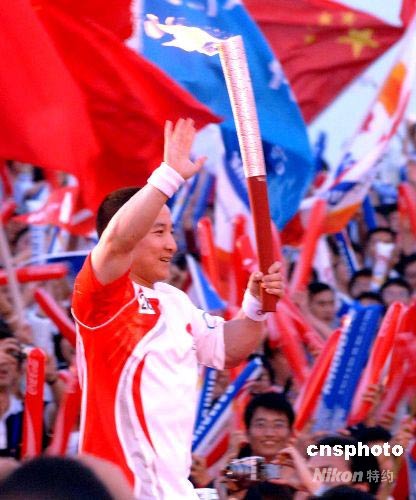 5月11日18時20分,隨著北京奧運會火炬接力境內傳遞福建福州站最后一棒火炬手雅典奧運會舉重冠軍石智勇跑進福州市望龍臺公園慶祝會場,奧運圣火福州站傳遞圓滿結束。當日,208名火炬手完成了28.6公里福州站的火炬傳遞。 中新社發 劉可耕 攝