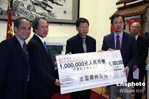 旅法華僑華人心念四川地震災區,連日來,各華人社團開展多種形式的募款活動,至十五日下午,捐款總額已逾九百萬元人民幣,超過今年初向中國南方受冰凍雨雪災害省份捐助的七百多萬元人民幣。中新社發 吳衛中 攝