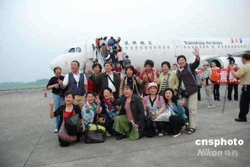 5月16日晚8時20分,165名被困九寨溝的臺灣游客乘坐臺灣復興航空公司飛機離開重慶返臺。從16日晚至17日凌晨,還將有臺灣中華航空公司、長榮航空公司兩架飛機飛抵重慶,轉運近七百名在四川災區被困臺灣游客返家。圖為即將返家的臺胞們在重慶機場合影留念。中新社發 康祖斌 攝