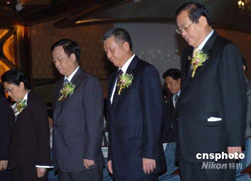 五月十九日,澳門特首何厚鏵(右二)在美高梅金殿默哀,悼念四川地震遇難同胞。當日至二十一日為全國哀悼日。中新社發 史利 攝
