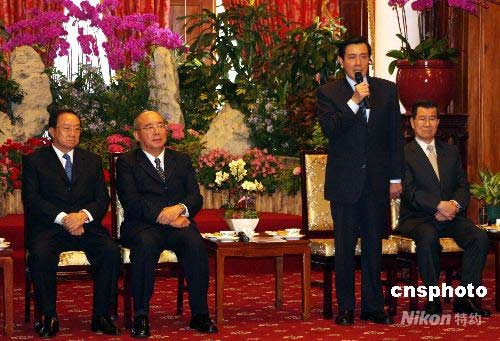 5月24日上午,馬英九、蕭萬長在臺北賓館與將于26日前往大陸訪問的中國國民黨主席吳伯雄一行茶敘,為其餞行。中新社發 陳立宇 攝