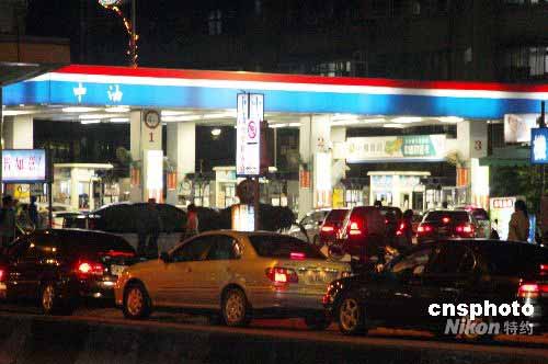 臺灣島內二十八日凌晨全面調升油價,當晚上各加油站排滿汽車長龍。圖為中油公司附近一個加油站場景。中新社發 陳立宇 攝