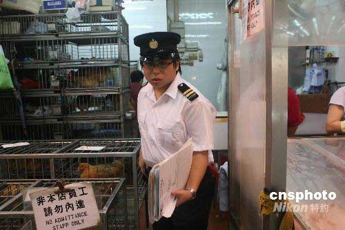 六月七日,香港一名工作人員對(duì)銅鑼灣街市一家活雞攤檔進(jìn)行巡查。香港食物及衛(wèi)生局局長(zhǎng)周一岳當(dāng)日表示,確定月初在保安道街市抽取的五個(gè)雞只樣本,帶有H5N1禽流感病毒,特區(qū)政府對(duì)禽流感的應(yīng)變級(jí)別將由原來(lái)的“戒備”級(jí)別,升為“嚴(yán)重”級(jí)別。中新社發(fā) 武仲林 攝