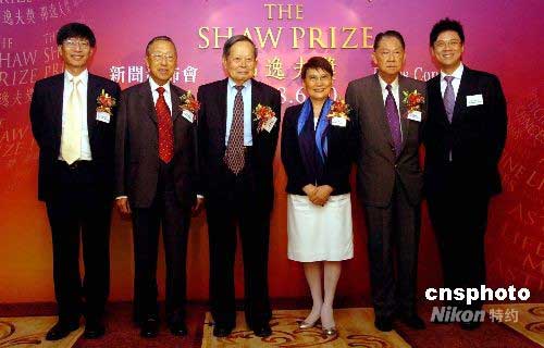 六月十日,二零零八年度“邵逸夫獎”在香港舉行新聞發布會,公布今屆得獎人名單及獲頒獎項,而頒獎典禮將于九月九日舉行。邵方逸華女士、馬臨教授(右二)、楊綱凱教授、譚尚渭教授及楊振寧教授(左一起)等“邵逸夫獎”理事會成員與擔任司儀的陳志云(右一)在新聞發布會后合照。中新社發 鄧慶樂 攝