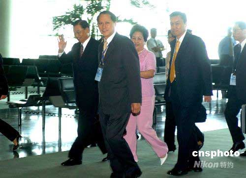 六月十一日,江丙坤董事長(前)率臺灣海灣交流基金會抵達澳門國際機場,作短暫停留后轉機赴北京與海協會進行中斷近十年的兩會協商會談。中新社發 史利 攝