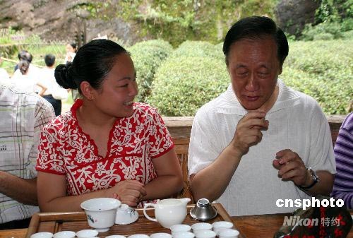 六月十九日下午,在福建參加“六·一八”項(xiàng)目成果交易會的臺灣新黨主席郁慕明來到武夷山參觀考察。圖為郁慕明在當(dāng)?shù)刂鑸@大紅袍景點(diǎn)學(xué)習(xí)武夷茶藝。中新社發(fā) 周文杰 攝
