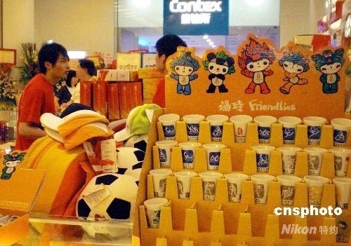 距離北京奧運開幕日子越來越近,香港一些商場銷售奧運紀念品的專柜生意紅火。 中新社發 洪少葵 攝