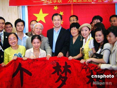 凝聚著全法中國學人心系北京奧運的兩條“奧運長虹”——簽名條幅12日下午會師巴黎,這兩條各長20余米的條幅今年2月8日以法國南部城市馬賽為起始點,分東、西兩線,由南至北,傳遍法國40多個城市。圖為全法學聯在中國駐法國大使館舉行慶祝儀式。中新社發 王倩 攝