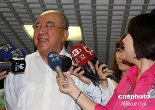 7月26日,中國國民黨主席吳伯雄在臺北參與國民黨中常委選舉投票后接受記者采訪,笑著重申將應邀參加北京奧運會。中新社發 董會峰 攝