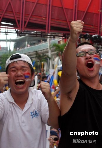 8月16日,征戰北京奧運的中華臺北棒球隊奮戰九局,0:1惜敗勁旅古巴,三連敗后出線前景渺茫。當日,數以千計的臺灣球迷聚集臺北東區觀看大屏幕直播,圖為現場兩名狂熱的年輕人。中新社發 董會峰 攝