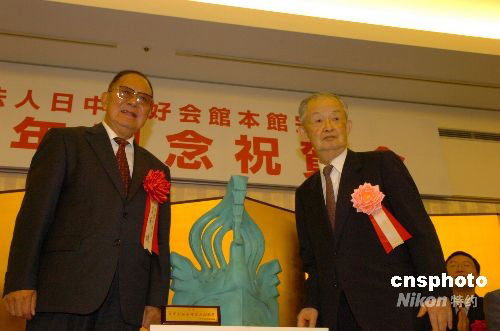 9月5日,日本財團法人日中友好會館舉行大型酒會慶祝該會本館建館20周年,中國日本友好協會會長宋健、中國駐日大使崔天凱、日本眾院議長河野洋平等數百名中日友好人士出席。圖為宋健會長(左)代表中方向日中友好會館會長林義郎先生贈送賀禮——雕塑作品《鳳凰》。中新社發 朱沿華 攝