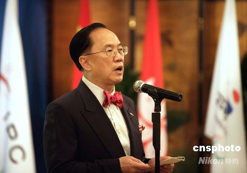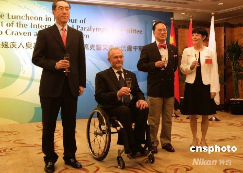 九月十日,香港行政長官曾蔭權在酒店舉行午宴,歡迎殘奧委員會主席克雷文爵士訪港。午宴前曾蔭權、克雷文爵士在歡迎午宴上分別致辭。 中新社發 張勤 攝