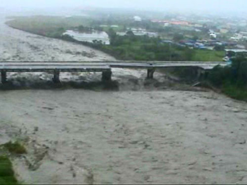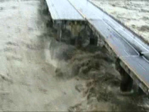 因森拉克臺風豪雨影響,臺灣臺中縣后豐大橋日前發生斷裂垮塌,造成三車六人墜落橋下遭滾滾洪水沖走慘劇。圖為空中勤務總隊直升機空拍斷橋全景的鏡頭!爸醒肷纭眻D