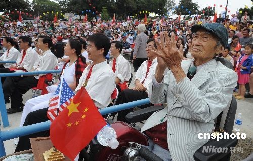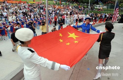 當(dāng)?shù)貢r(shí)間9月21日上午,數(shù)百名洛杉磯華人華僑在華人聚居的蒙特利公園市舉行隆重的升國(guó)旗儀式,慶祝中華人民共和國(guó)成立59周年。中新社發(fā) 張煒 攝