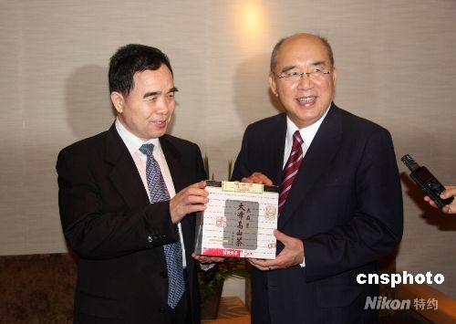 圖為吳伯雄向柳斌杰贈送臺灣的“太峰高山茶”。