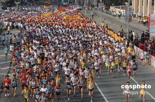 十月一日上午八時許,澳門各界民眾參加的“國慶歡樂跑”在金蓮花廣場啟動。“歡樂跑”是澳門國慶日一項傳統民間體育活動。中新社發 畢永光 攝