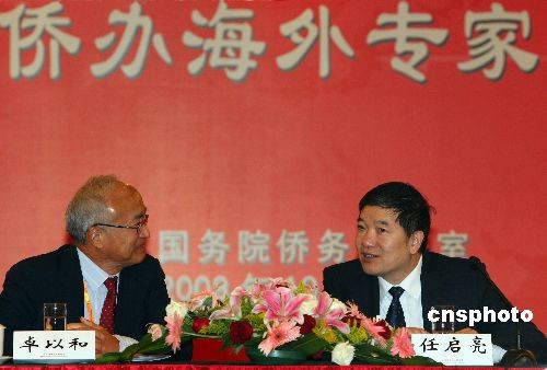 10月27日,第二屆國務院僑辦海外專家咨詢委員會會議在北京舉行。圖為國務院僑務辦公室副主任任啟亮(右)與華裔美籍電機工程學家卓以和(左)在會上交流。中新社發 廖文靜 攝