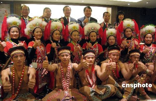 受兩岸兩會在臺北簽署四項協議等利多因素影響,11月19日,臺灣觀光業者首次大規模組團“登陸”上海,參展“二00八中國國際旅游交易會”。臺灣觀光協會組織的三百余名業者及相關機構代表甫抵上海,在臺商聚集的福泰商務酒店召開記者會。圖為臺灣南投縣九族文化村的少數民族歌舞團隊亮相記者會,表達臺灣民眾的好客之情。中新社發 許曉青 攝