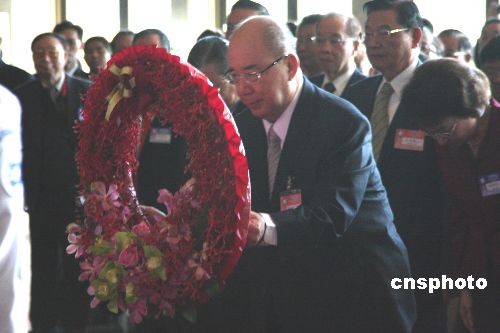 11月22日,中國國民黨第十七次全代會臨時會議在臺北“國父紀念館”舉行。圖為會議前,國民黨主席吳伯雄率黨內同仁在紀念館內向中山先生銅像獻花致敬。中新社發(fā) 劉舒凌 攝