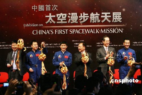 十二月六日,“中國首次太空漫步航天展”在香港科學館揭幕,神舟七號返回艙、航天服和航天員出艙后所展示的國旗等珍貴展品和圖片在展會上亮相。香港特區政府政務司司長唐英年、神舟七號載人航天飛行赴港代表團團長暨中國載人航天工程副總指揮張建啟、神七航天員翟志剛、劉伯明、景海鵬等出席揭幕儀式。中新社發 武仲林 攝