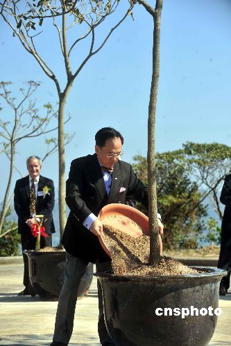 一月五日,香港科技大學與普林斯頓大學高等研究院簽訂協議,合作成立科大高等研究院,香港特首曾蔭權特到場植樹紀念。中新社發 譚達明 攝