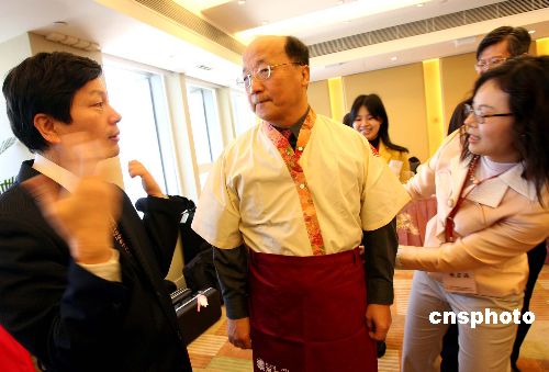 一月八日,臺灣中部四縣市在香港世貿中心舉辦“中臺灣迷你旅展及特產展”活動。圖為臺中市長胡志強穿上民族服飾,向媒體宣傳臺灣中部的特色景觀。中新社發 洪少葵 攝